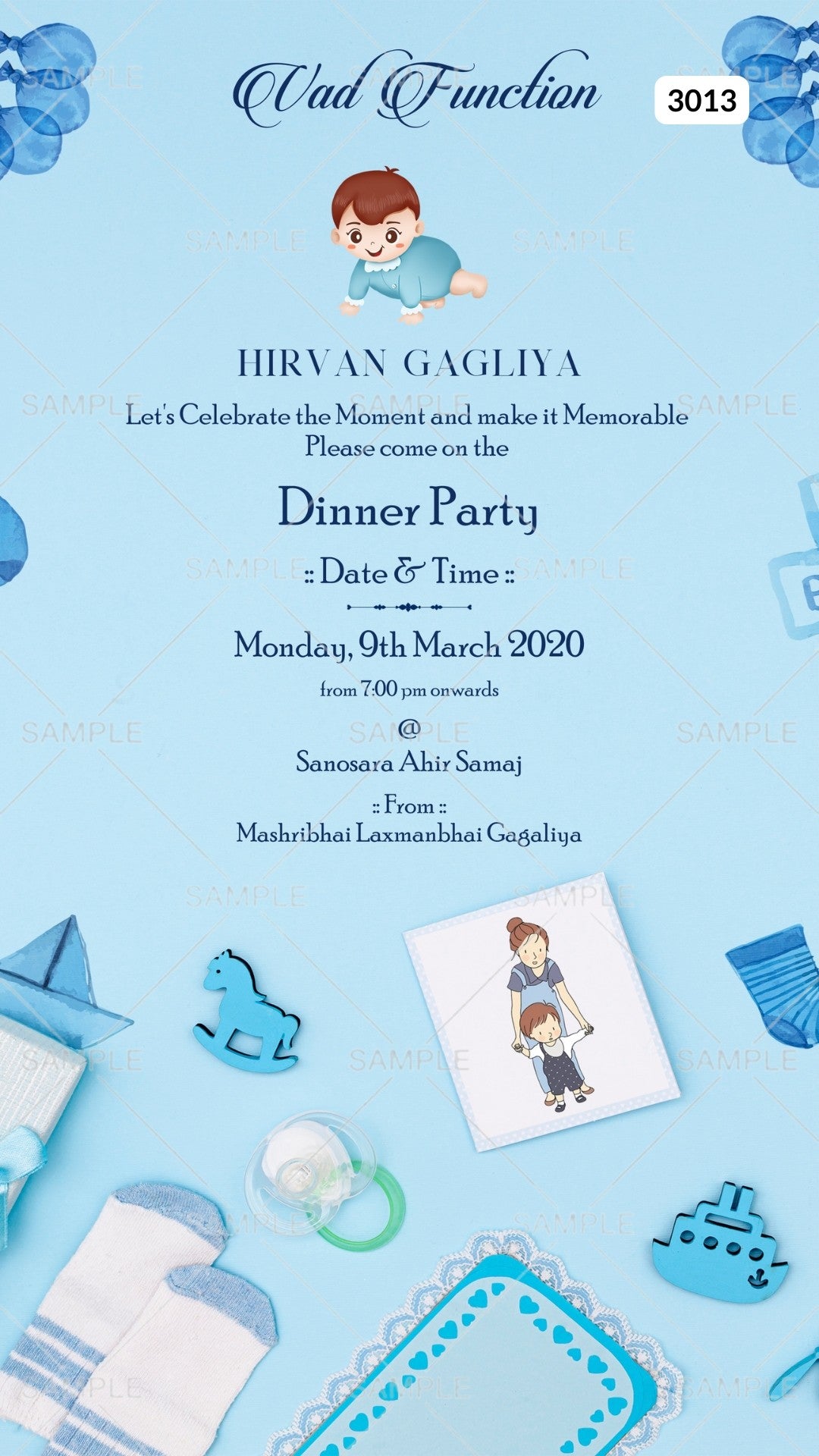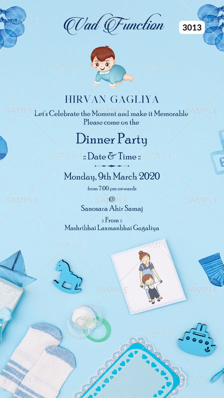 The Playful Theme of the hindu Indian Vad Function Digital Invitation Editable Canva Template in Pastel Blue background color. This e-invite card is perfectly suitable for Gujarati families and is available in the English language. It includes elements such as horse, shocks, baby doodle, boat This card design can be customized online for free in Canva, and you can edit baby name, date, time, venue. You can also share your card easily via WhatsApp or email.