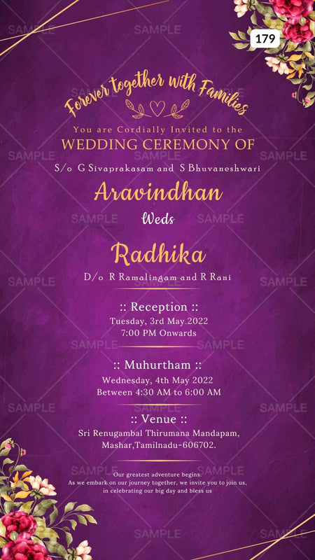 The Floral theme of the hindu South Indian Wedding and Reception Ceremony Digital Invitation Canva Editable in Purple background color. This e-invite card is perfectly suitable for Tamil families and is available in the English language. It includes elements such as Pink and white flowers, leaves, heart. This card design can be customized online for free in Canva, and you can edit couple name, parents name, date, time, venue. You can also share your card easily via WhatsApp or email.