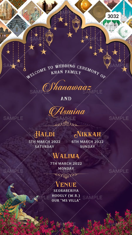 The Indian Traditional Arch Gate and Floral theme of the Hindu Bengali Family Wedding Ceremony Digital Invitation Editable Canva Template is in a light purple background color. This e-invite card is perfectly suitable for Bengali families and is available in the English language. It includes elements such as a temple arch gate frame, red flowers, golden lanterns, and peacocks. This card design can be customized online for free in Canva, and you can edit the function name, couple name, date, time, venue, and regards. You can also share your card easily via WhatsApp or email.