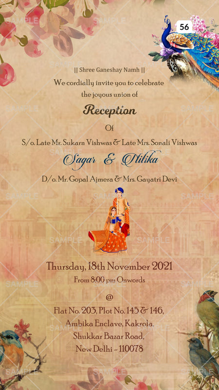 Reception Party invitation card Canva Editable Template in english language with peacock, birds as vintage theme design 56