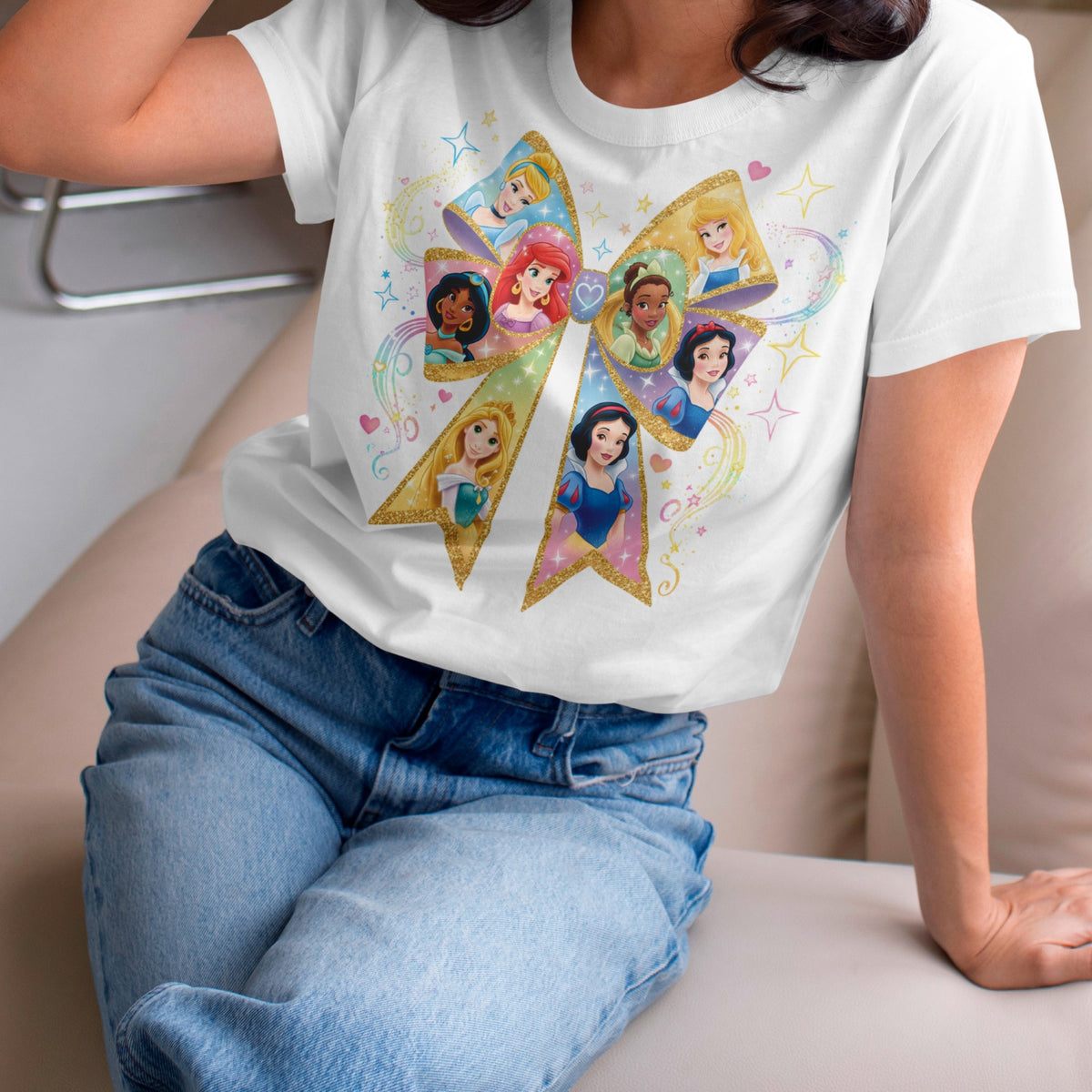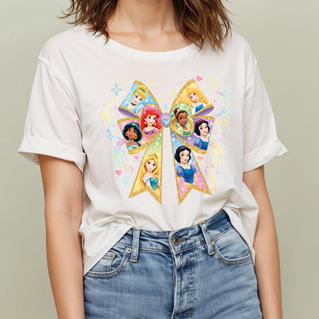 This beautiful digital design features a large, glittery bow with your favorite Disney Princesses, including Ariel, Belle, and Snow White. Perfect for creating custom apparel, gifts, and merchandise, this high-quality PNG is ideal for any princess fan.