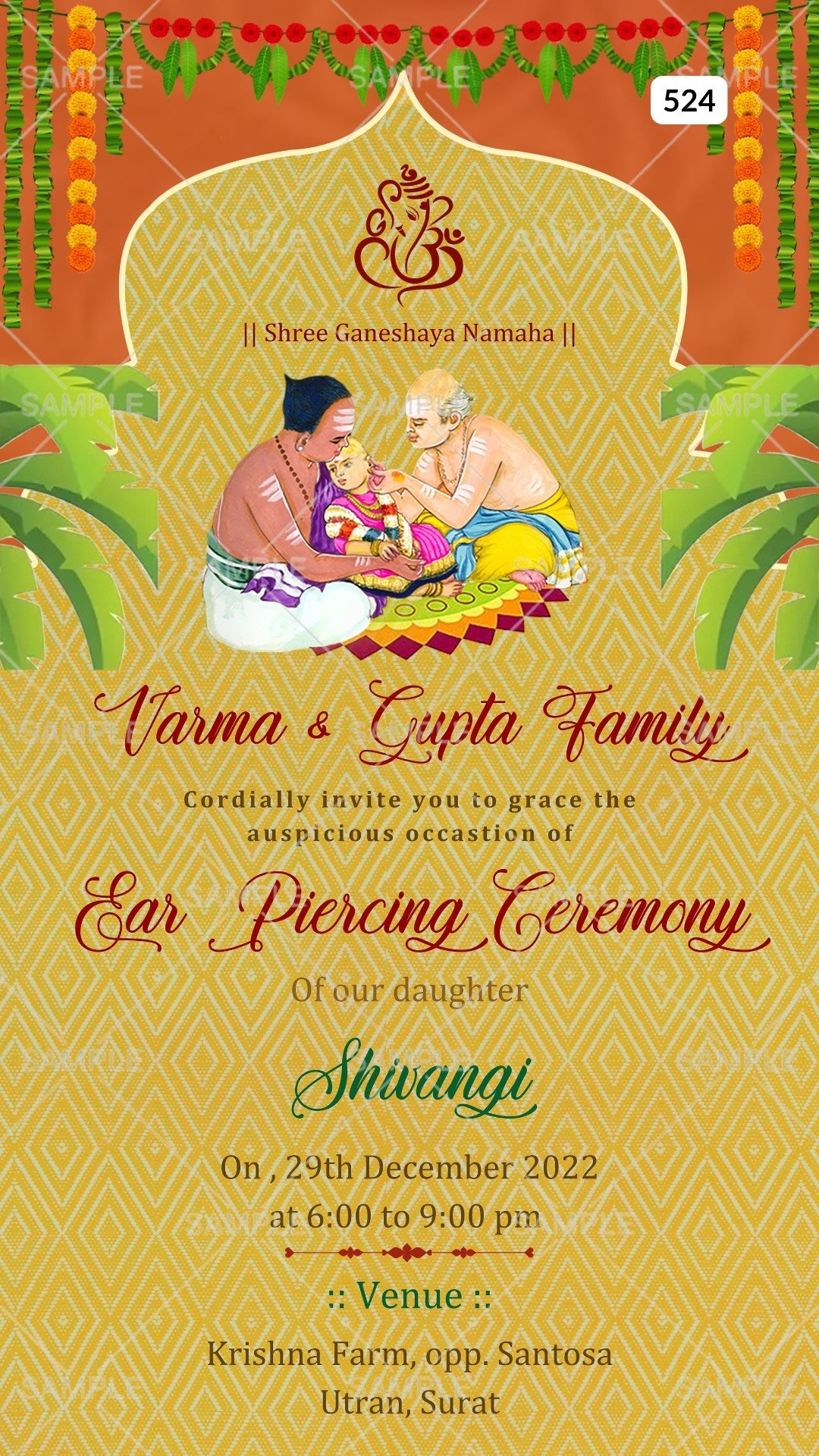 Ear Piercing ceremony invitation card Canva Editable Template in english language with banana leaves, garland as arch frame theme design 524