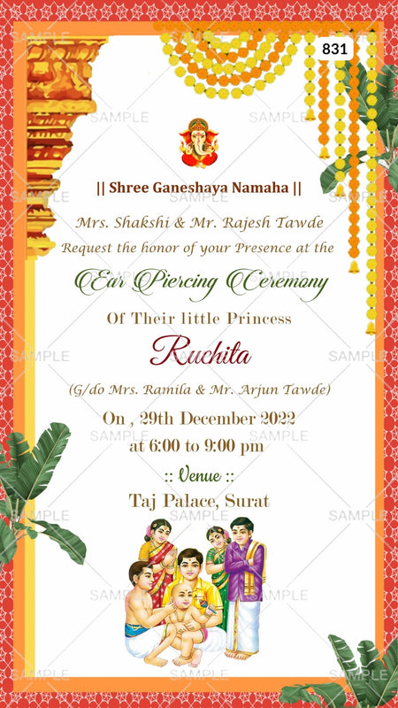 The traditional Theme of the Ear Piercing ceremony digital invitation Canva Editable in white background color. This Karnavedha ceremony e-invite editable template is available in the English language. This Ear piercing ceremony includes elements such as marigold garland, a Ganesha logo, pillars, banana leaves, ear piercing doodle, and vintage border. This card design can be customized online for free in Canva, and you can edit the name, date, time, function name and venue. You can also share your card easily via WhatsApp or email.
