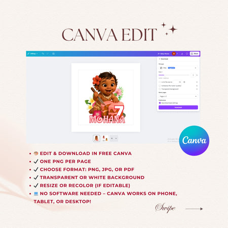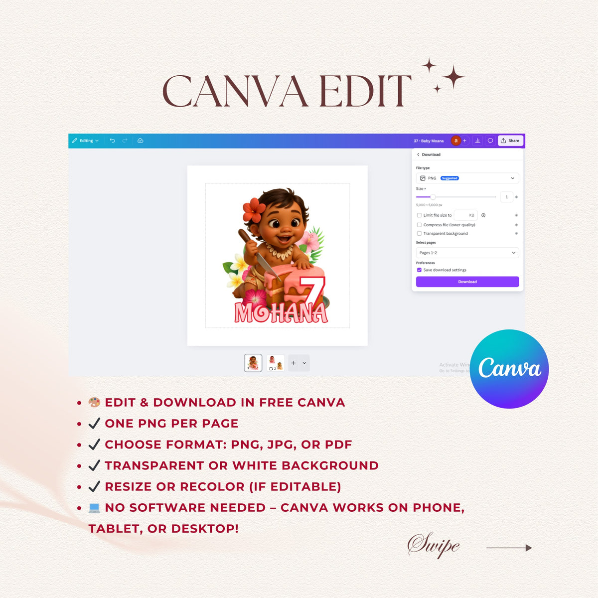 Inspired by the beloved movie, this adorable digital design features a cute baby Moana and is fully customizable. Perfect for creating personalized birthday shirts, party invitations, and decorations, you can easily add a custom name and age to make your little one's special day unforgettable.