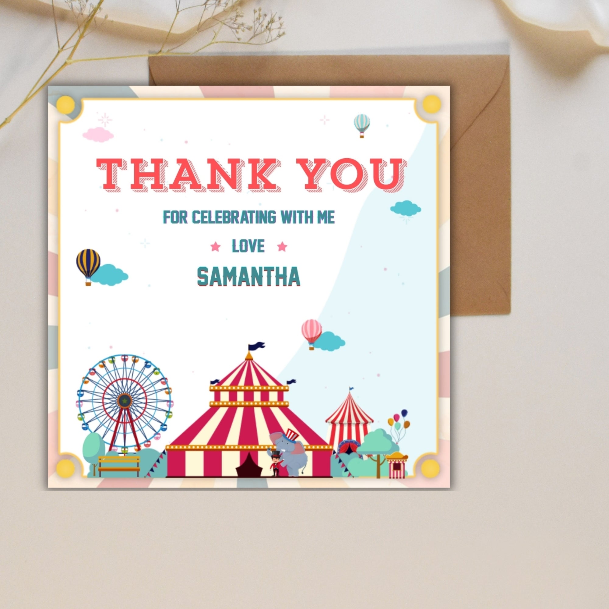 Editable Carnival Birthday Thank You Card Template, Circus Party Thank You, Kids Carnival Party Thank You Canva Template Instant Download A 1126