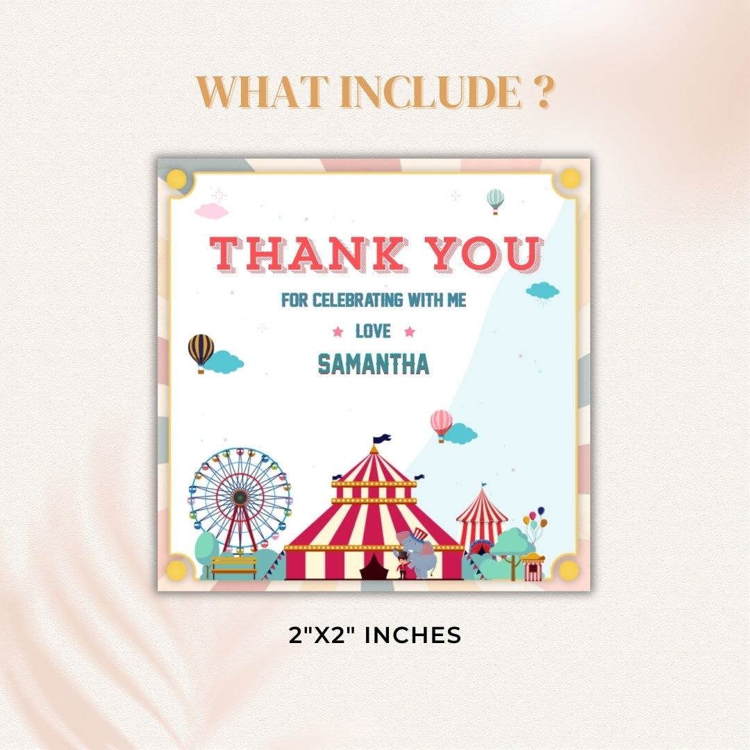 Show your appreciation with this adorable Editable Carnival Birthday Thank You Card Template, Circus Party Thank You, Kids Carnival Party Thank You Canva Template Instant Download. Featuring a colorful circus theme with carnival tent, ferris wheel, balloons, and playful illustrations, this card is perfect for thanking guests after a fun kids birthday party.
