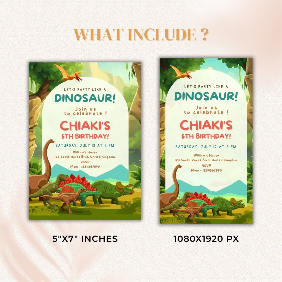 Invite your little dino-lovers to an unforgettable birthday party with this Dinosaur Birthday Invitation! Perfect for a dinosaur-themed celebration, this editable invitation allows you to customize the details and send it as a digital invitation. Whether you're celebrating a birthday or a themed event, this design will add a roar of fun!