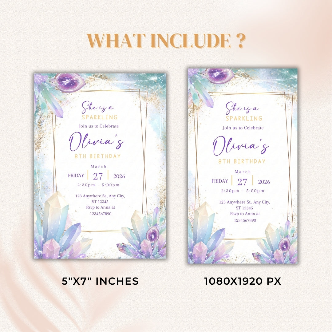 Make your birthday party sparkle with this Editable Crystal Birthday Invitation! Perfect for an 8th birthday celebration, this invitation features stunning crystals, sparkles, and glitter. With easy-to-edit templates, you can customize the details like the name, date, and time, and instantly download it for printing or sharing digitally.