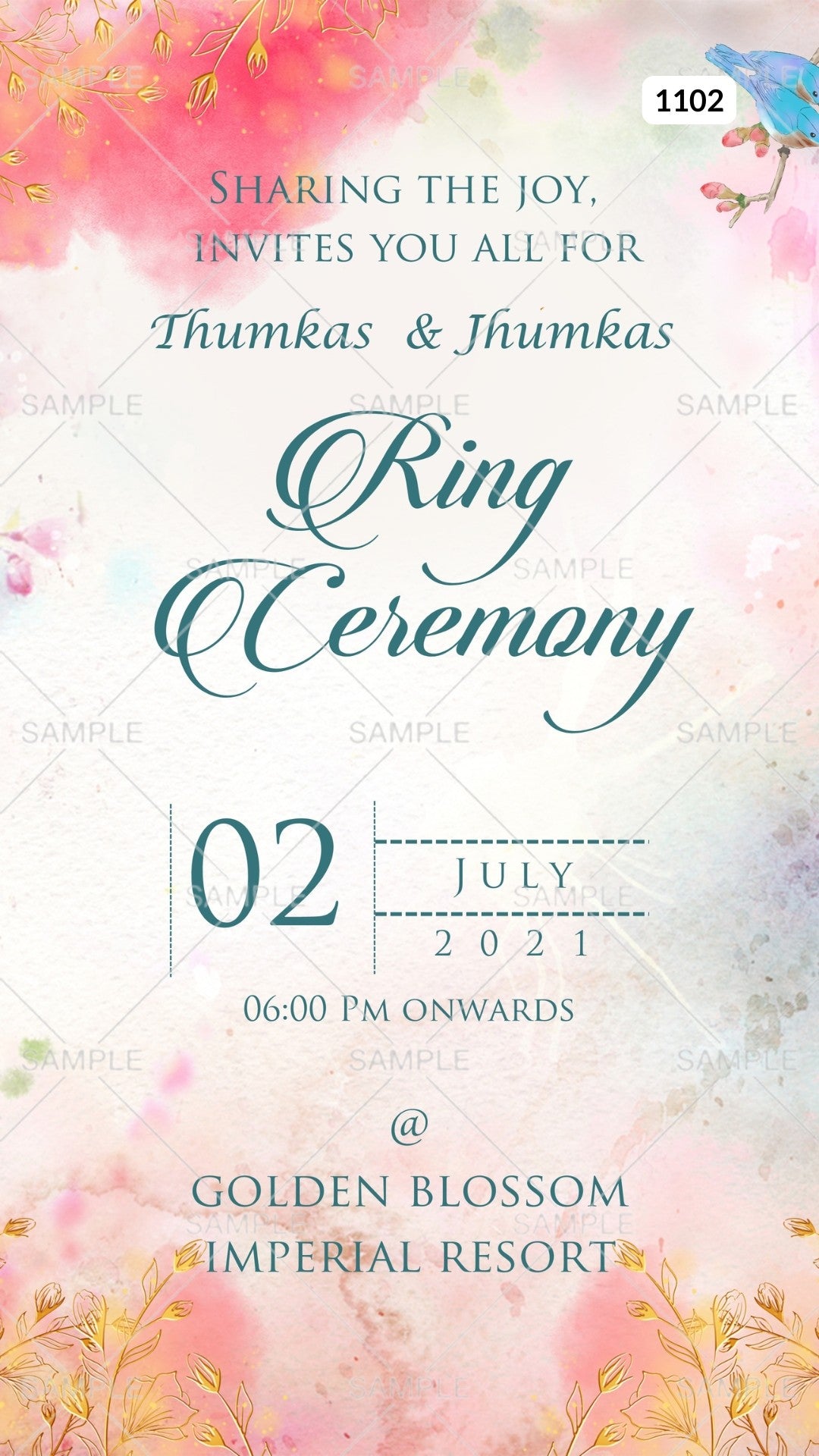 The minimalistic Theme of Engagement ceremony digital invitation Canva Editable in a pink splash background color. This e-invite editable template is available in English language. It includes elements such as birds, golden leaves, sparkles, and flowers. This card design can be customized online for free in Canva, and you can edit the couple's name, function name, date, time, venue, and regards. You can also share your card easily via WhatsApp or email.