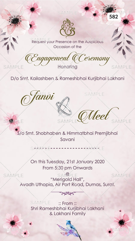 The floral Theme of Engagement ceremony digital invitation Canva Editable in the pink background color. This e-invite editable template is available in English language. It includes elements such as pink flowers, leaves, golden frame, ring, ganesh icon, and birds. This card design can be customized online for free in Canva, and you can edit the couple's name, function name, date, time, venue, and regards. You can also share your card easily via WhatsApp or email.
