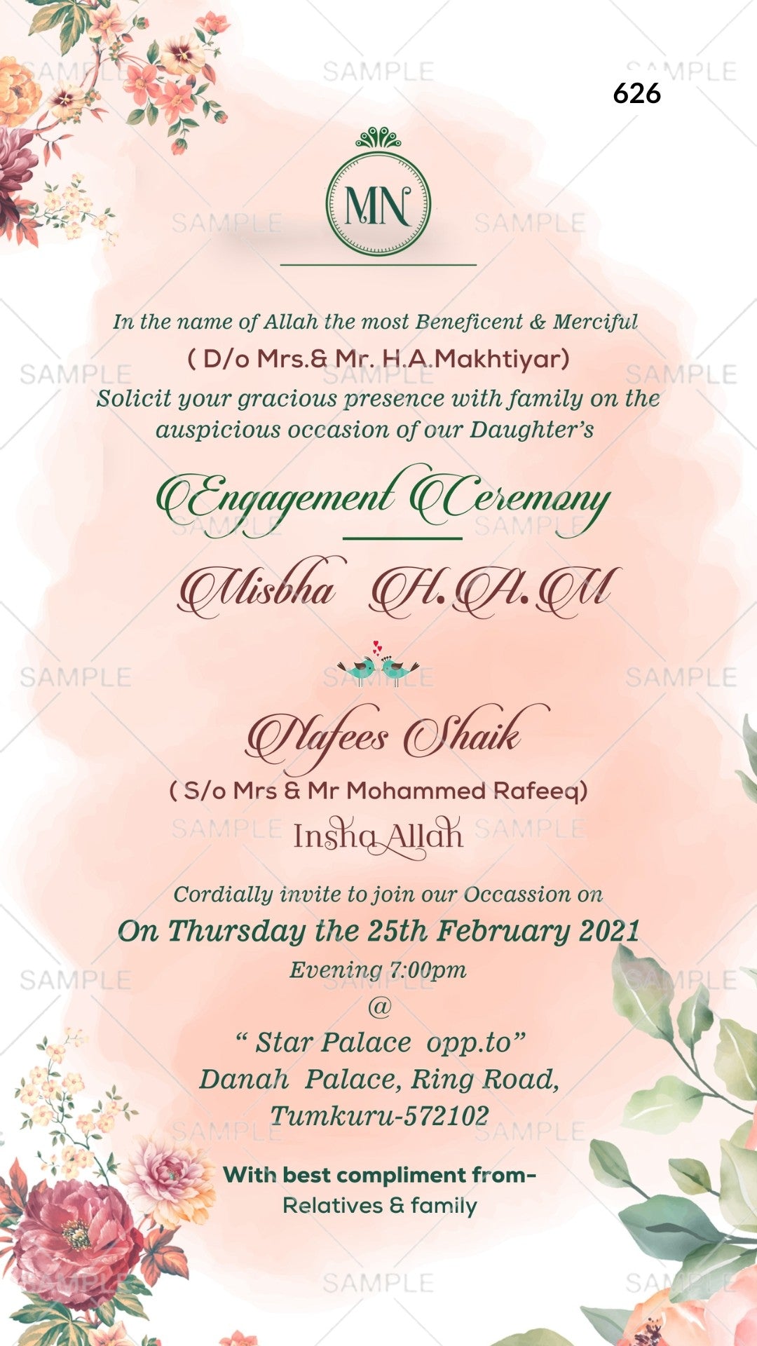 Engagement ceremony invitation card Canva Editable Template in english language with birds, leaves as floral theme design 626
