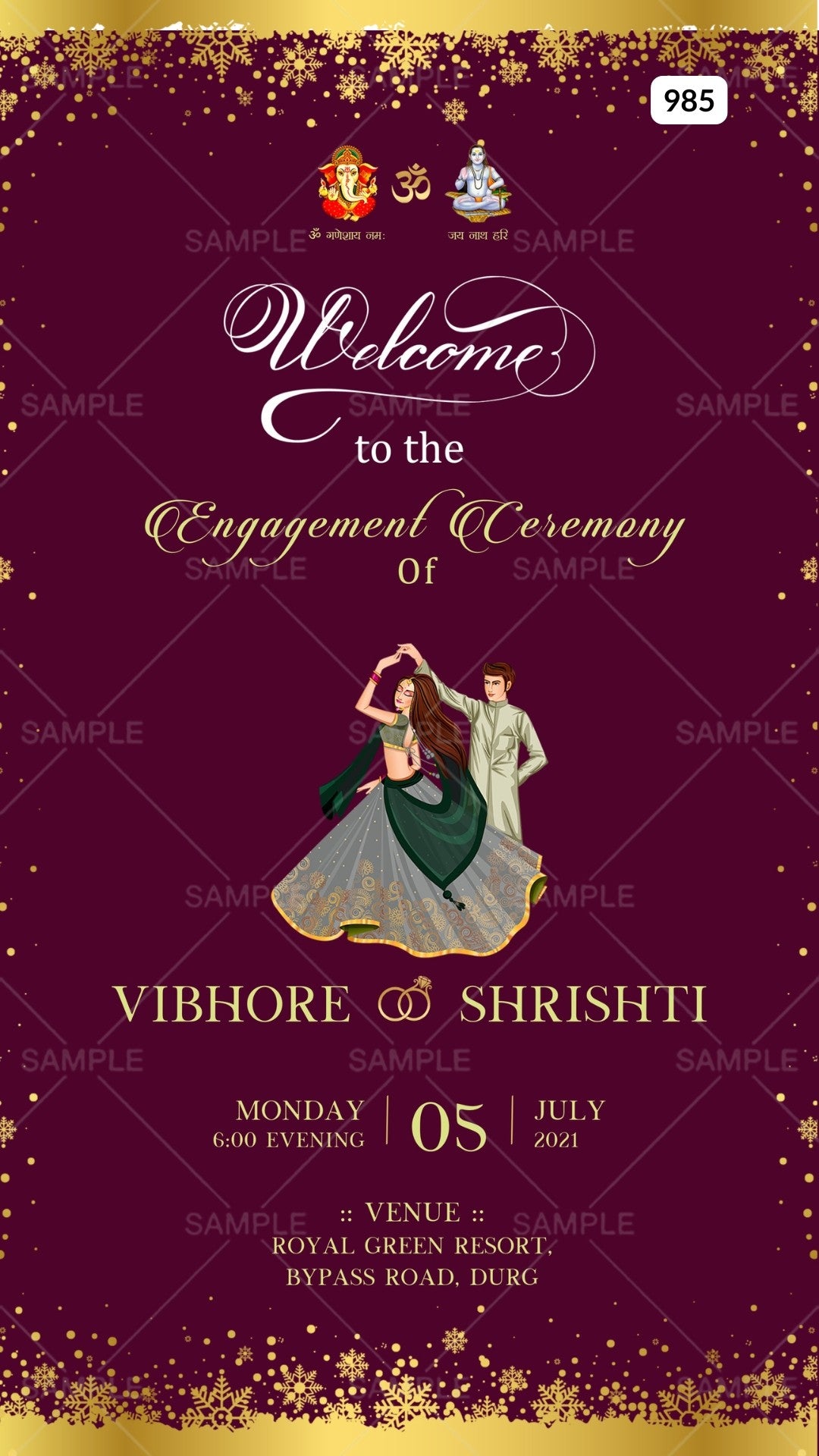The shining Theme of Engagement ceremony digital invitation Canva Editable in the maroon background color. This e-invite editable template is available in English language. It includes elements such as golden frame, glitters, couple doodle, god image. This card design can be customized online for free in Canva, and you can edit the couple's name, function name, date, time, venue, and regards. You can also share your card easily via WhatsApp or email.