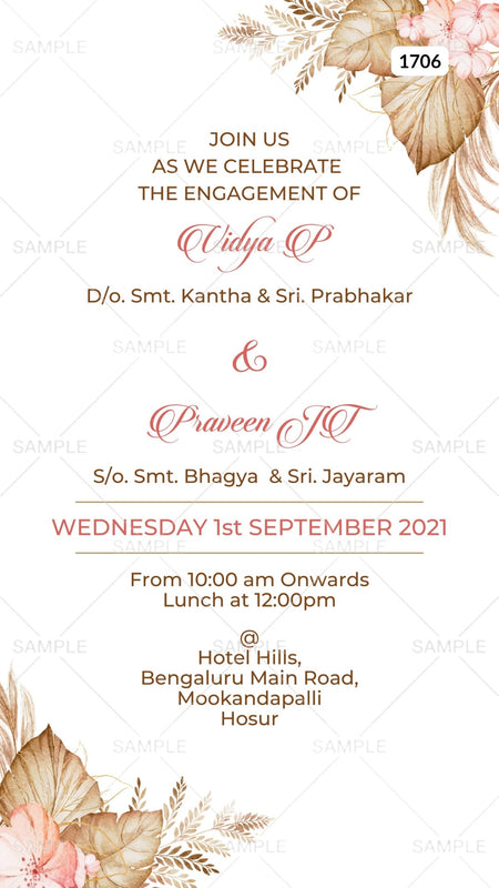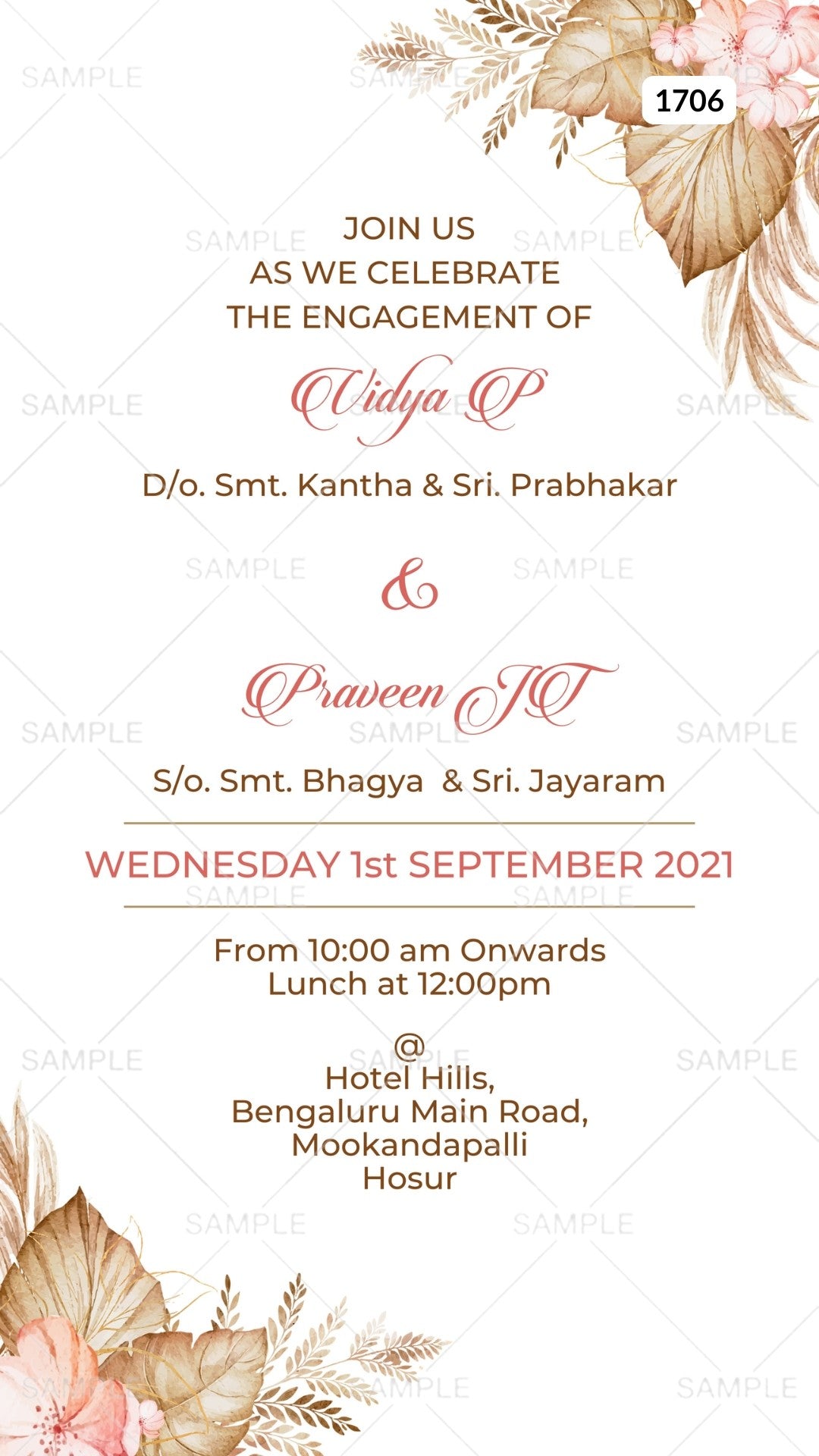 Engagement ceremony invitation card Canva Editable Template in english language with flowers, leaves as minimalistic theme design 1706