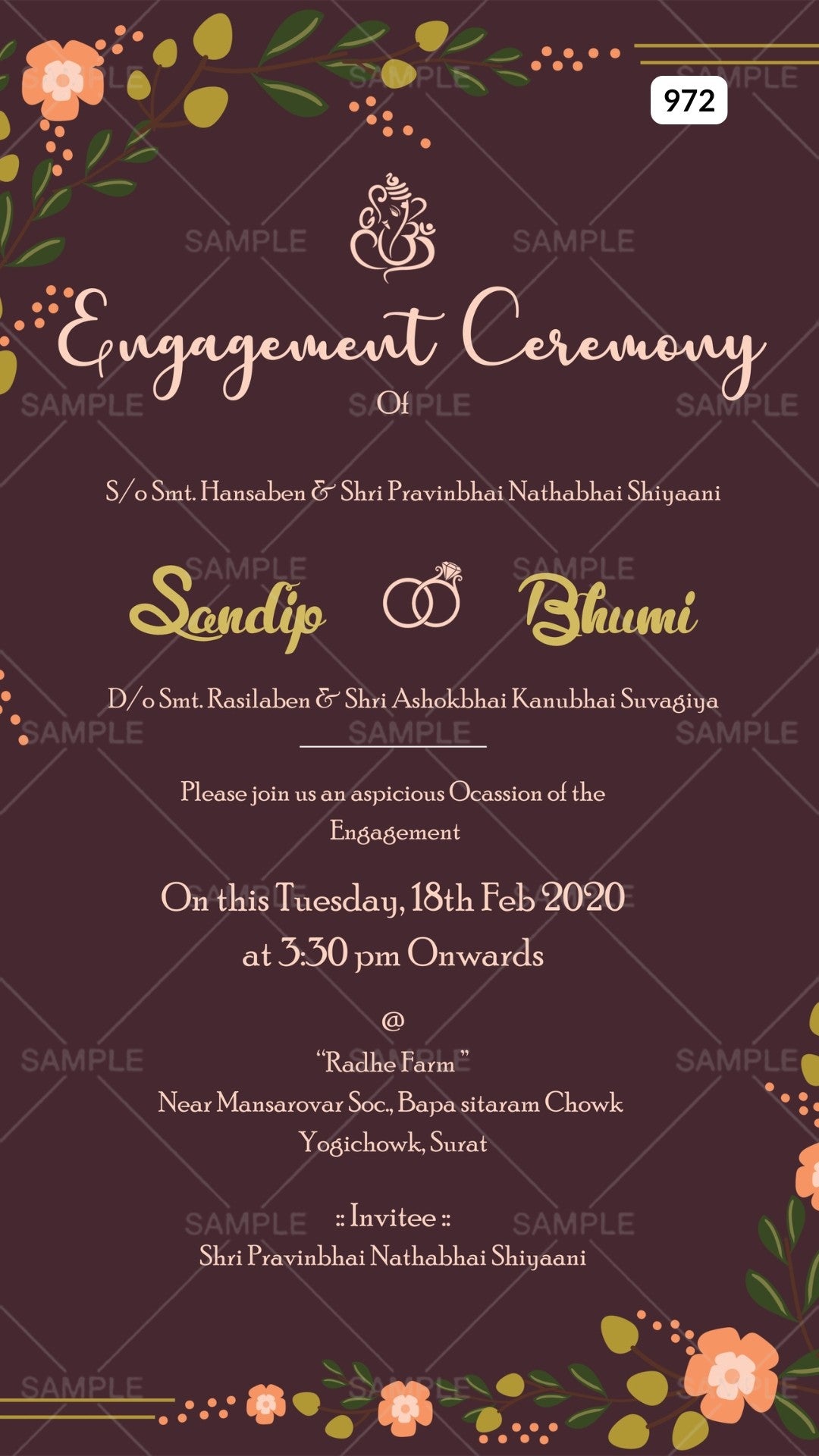Engagement ceremony invitation card Canva Editable Template in english language with flowers, leaves, ring as golden frame theme design 972