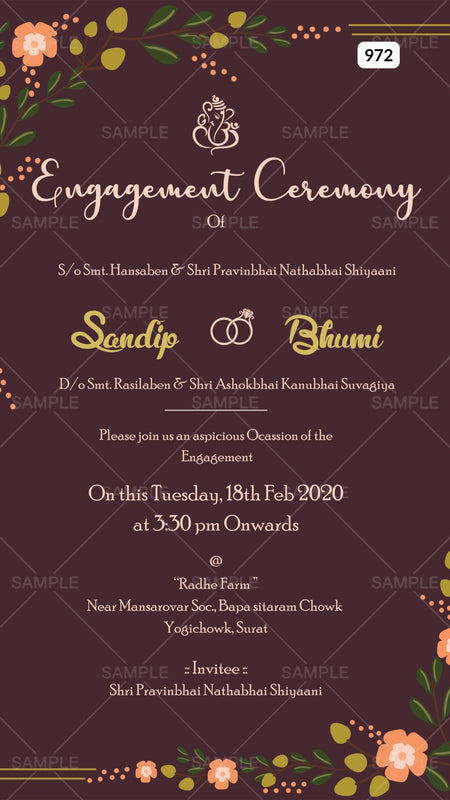 The golden frame Theme of Engagement ceremony digital invitation Canva Editable in brown background color. This e-invite editable template is available in English language. It includes elements such as flowers, leaves, ring, golden frame, and ganesh icon. This card design can be customized online for free in Canva, and you can edit the couple's name, function name, date, time, venue, and regards. You can also share your card easily via WhatsApp or email.
