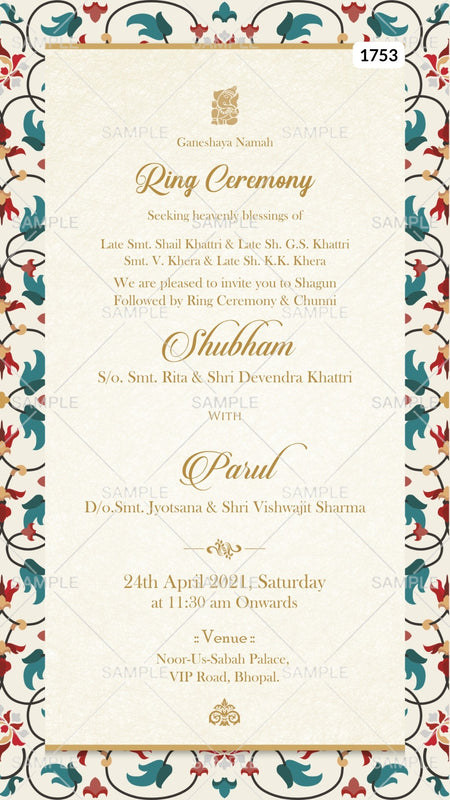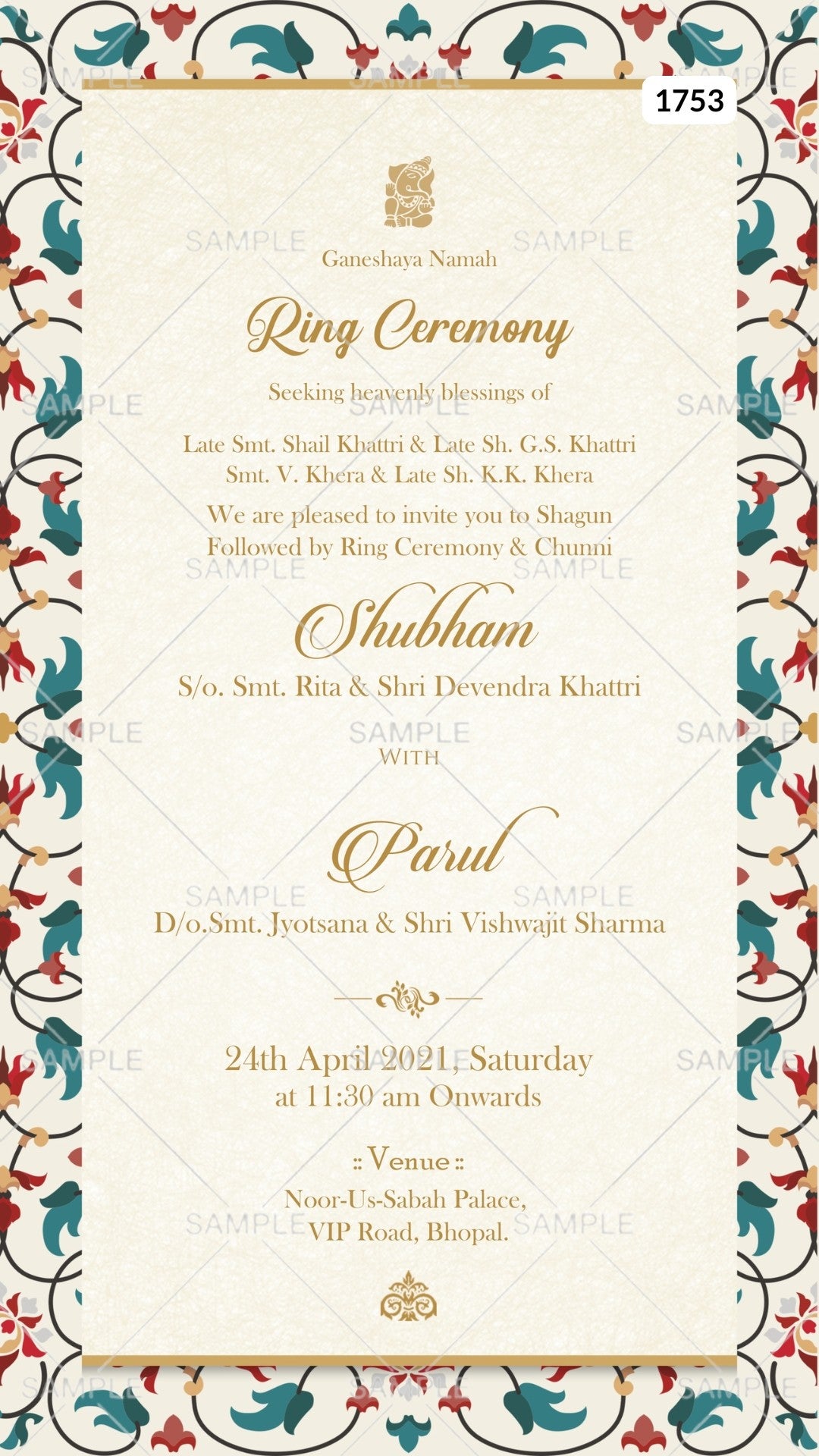 Engagement ceremony invitation card Canva Editable Template in english language with golden frame as traditional theme design 1753
