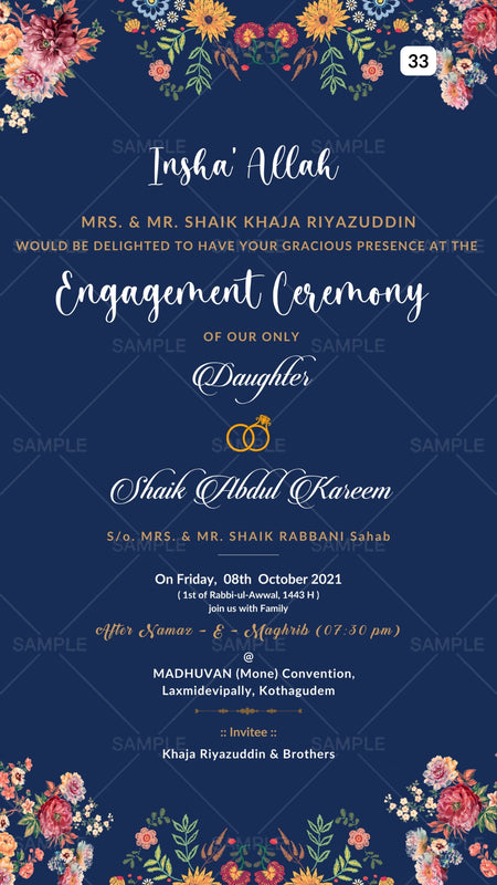 The floral Theme of the Engagement ceremony digital invitation Canva Editable in dark blue background color. This e-invite editable template is available in the English language. It includes elements such as pink and yellow flowers, green leaves, and golden ring. This card design can be customized online for free in Canva, and you can edit the couple's name, function name, date, time, venue, and regards. You can also share your card easily via WhatsApp or email.
