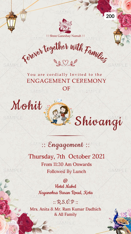 The floral Theme of the Engagement ceremony digital invitation Canva Editable in cream background color. This e-invite editable template is available in English language. It includes elements such as pink flowers, golden line, lantern, peacock, ring, couple doodle, and ganesh icon. This card design can be customized online for free in Canva, and you can edit the couple's name, function name, date, time, venue, and regards. You can also share your card easily via WhatsApp or email.