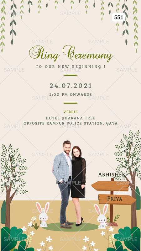 Engagement ceremony invitation card Canva Editable Template in english language with leaves, tree, rabbit, wooden board as couple photo theme design 551
