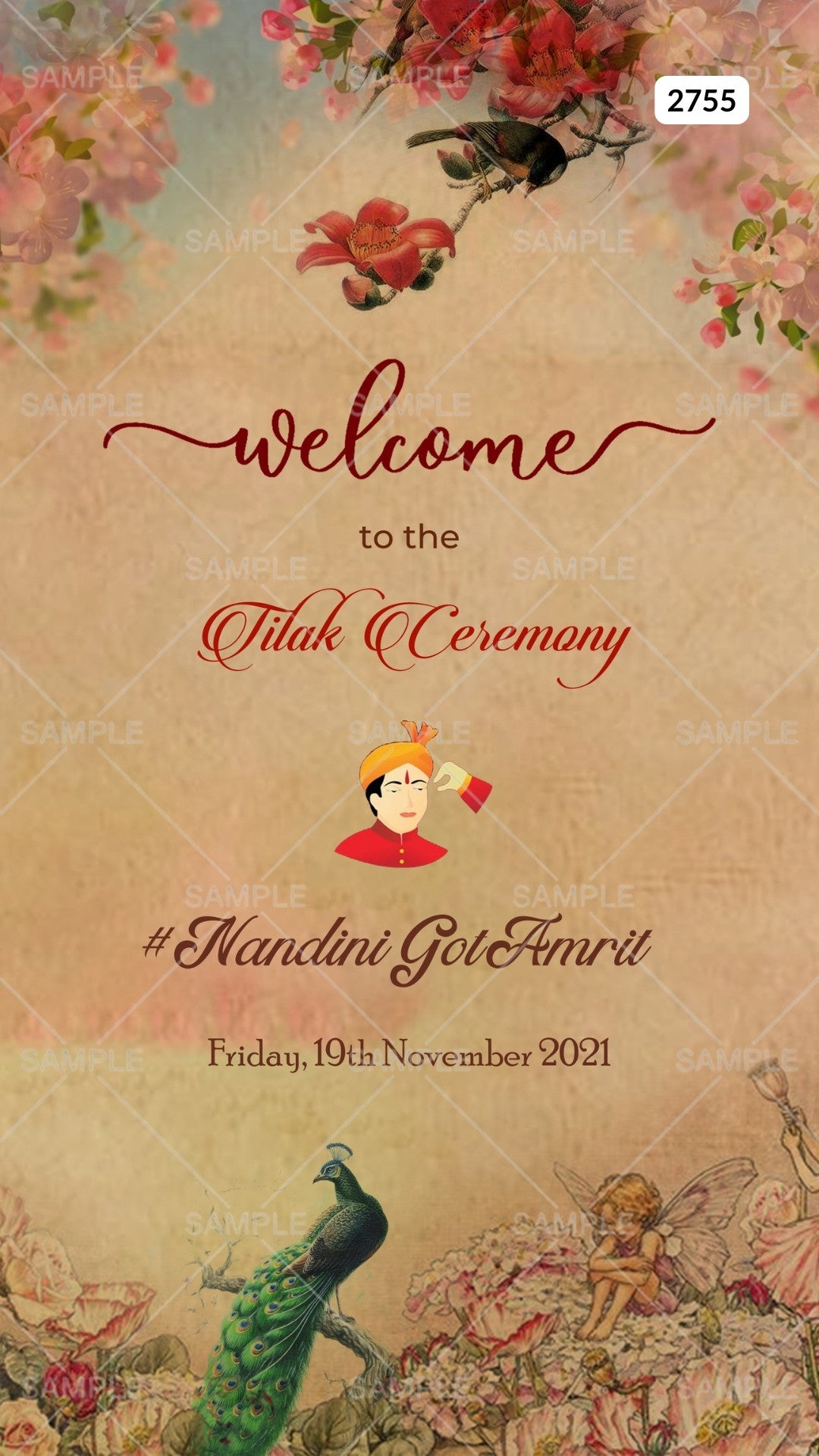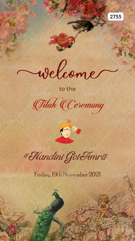Engagement ceremony invitation card Canva Editable Template in english language with peacock, birds as vintage theme design 2755