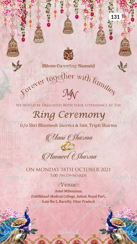 The traditional Theme of the Engagement ceremony digital invitation Canva Editable in pastel pink background color. This e-invite editable template is available in English language. It includes elements such as a peacock, lantern, Ganesh icon, birds, pink flowers, golden ring, name logo. This card design can be customized online for free in Canva, and you can edit the couple's name, function name, date, time, venue, and regards. You can also share your card easily via WhatsApp or email.