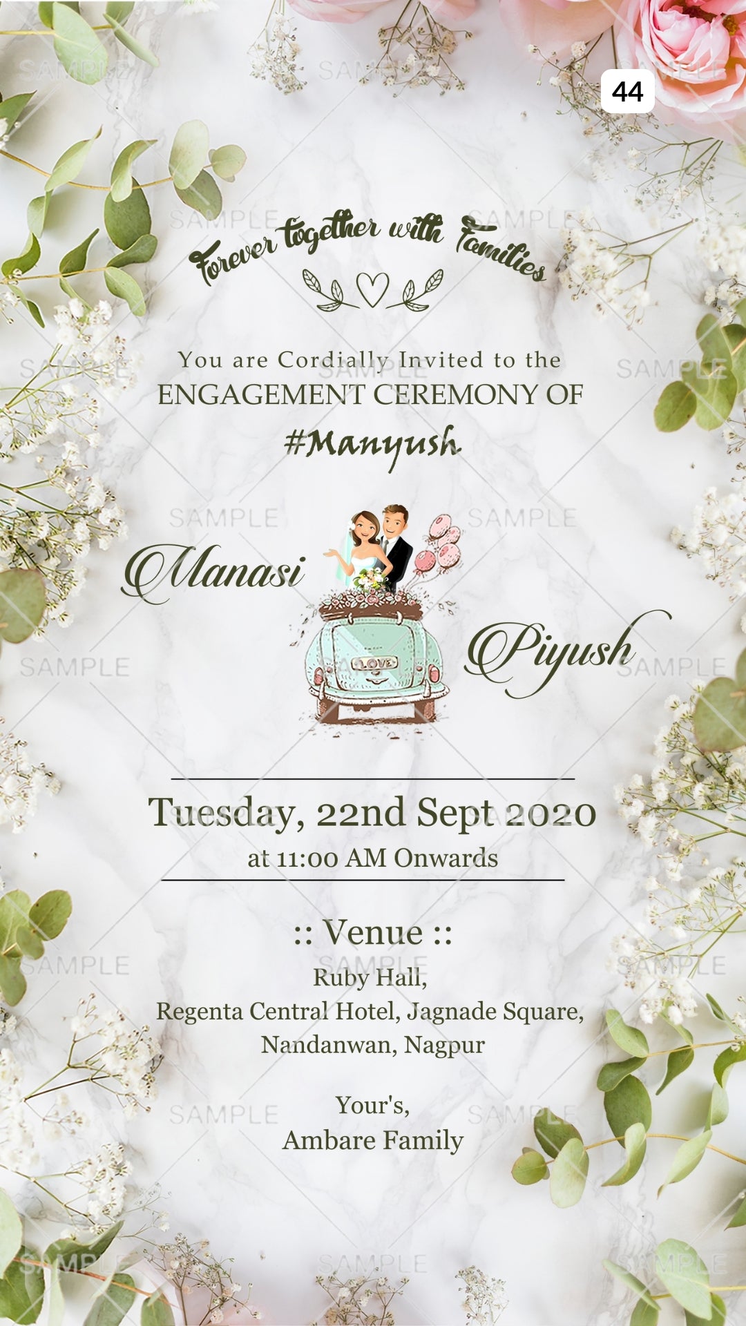 The artistic leaves Theme of the Engagement ceremony digital invitation Canva Editable in the off-white background color. This e-invite editable template is available in English language. It includes elements such as green leaves, pink rosem white flowers, car, balloon, couple doodle. This card design can be customized online for free in Canva, and you can edit the couple's name, function name, date, time, venue, and regards. You can also share your card easily via WhatsApp or email.
