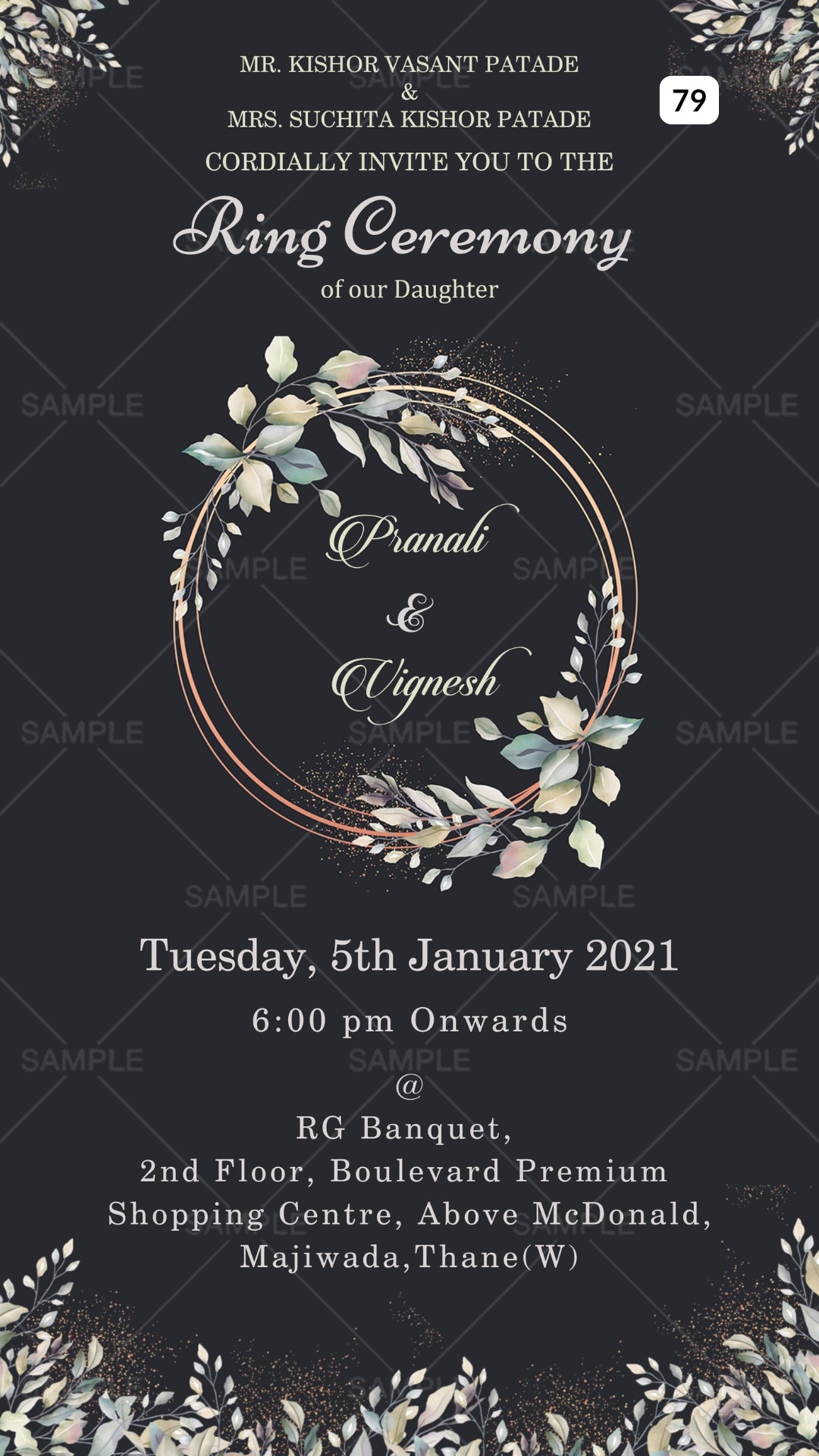 The artistic leaves Theme of the Engagement ceremony digital invitation Canva Editable in black background color. This e-invite editable template is available in English language. It includes elements such as green leaves, golden round frame, and sparkle. This card design can be customized online for free in Canva, and you can edit the couple's name, function name, date, time, venue, and regards. You can also share your card easily via WhatsApp or email.