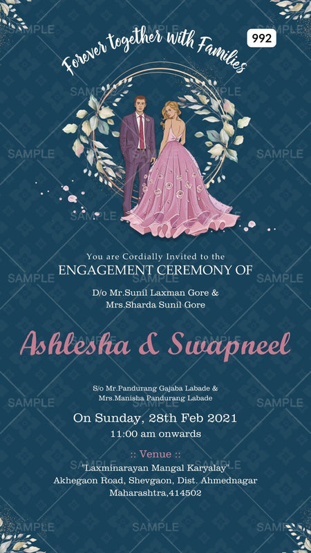 The artistic leaves Theme of Engagement ceremony digital invitation Canva Editable in the blue background color. This e-invite editable template is available in English language. It includes elements such as round golden frame, couple doodle, and leaves. This card design can be customized online for free in Canva, and you can edit the couple's name, function name, date, time, venue, and regards. You can also share your card easily via WhatsApp or email.