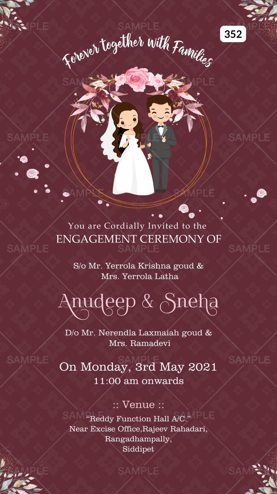 Engagement ceremony invitation card Canva Editable Template in english language with round frame as floral theme design 352