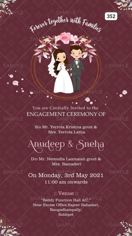 The floral Theme of Engagement ceremony digital invitation Canva Editable in brown background color. This e-invite editable template is available in English language. It includes elements such as green leaves, round golden frame, couple doodle, pink roses, and sparkle. This card design can be customized online for free in Canva, and you can edit the couple's name, function name, date, time, venue, and regards. You can also share your card easily via WhatsApp or email.