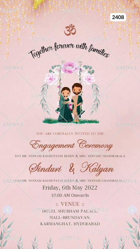 The minimalistic Theme of Engagement ceremony digital invitation Canva Editable Template in pastel pink background color. This e-invite editable template is available in English language. It includes elements such as string light, couple doodle, flowers, leaves, om logo. This card design can be customized online for free in Canva, and you can edit the couple's name, function name, date, time, venue, and regards. You can also share your card easily via WhatsApp or email.