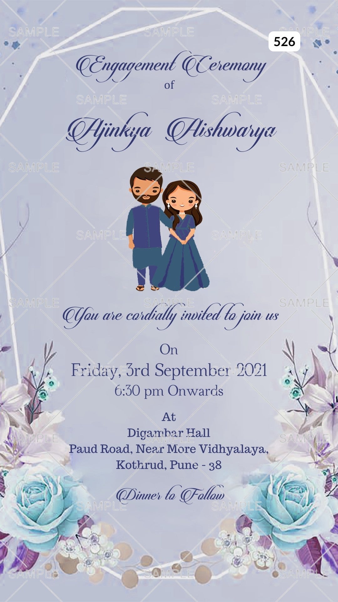 Engagement ceremony invitation card Canva Editable Template in english language with couple doodle, frame as floral theme design 526