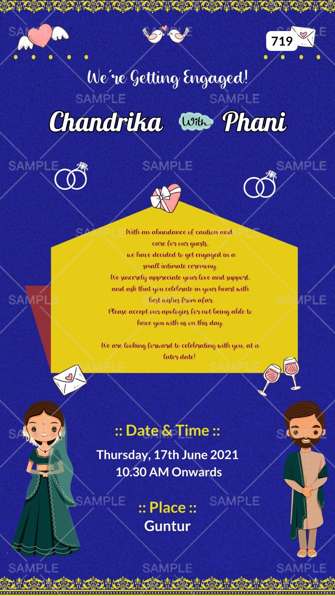 The minimalistic Theme of Engagement ceremony digital invitation Canva Editable in the blue background color. This e-invite editable template is available in English language. It includes elements such as couple doodle, hearts, birds, glass, cards, and cloud. This card design can be customized online for free in Canva, and you can edit the couple's name, function name, date, time, venue, and regards. You can also share your card easily via WhatsApp or email.