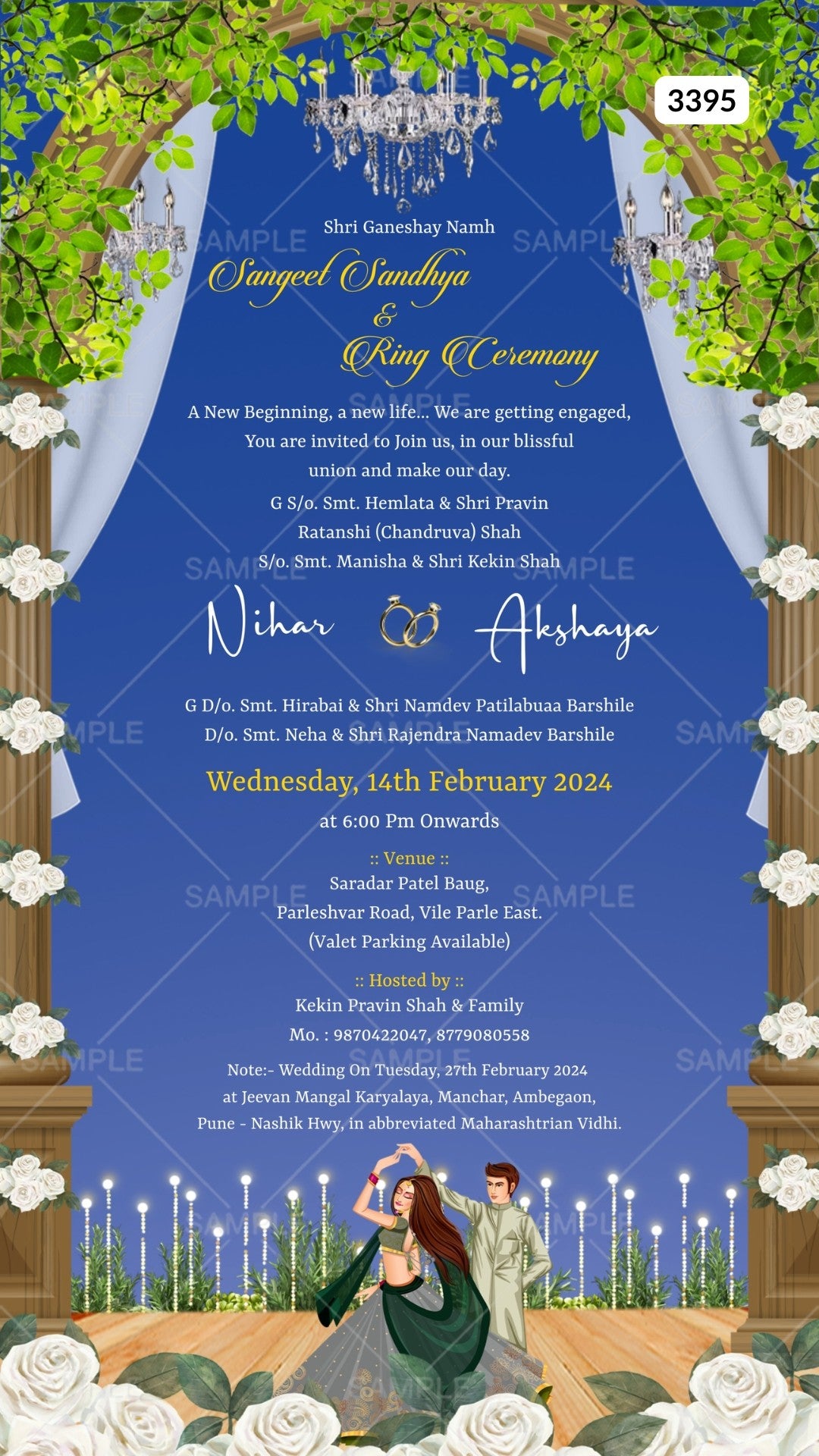 The wooden gate Theme of Engagement ceremony digital invitation Editable Canva Template in blue background color. This e-invite editable template is available in English language. It includes elements such as leaves, couple doodle, hanging, floar, curtains, ring, and flowers. This card design can be customized online for free in Canva, and you can edit the couple's name, function name, date, time, venue, and regards. You can also share your card easily via WhatsApp or email.