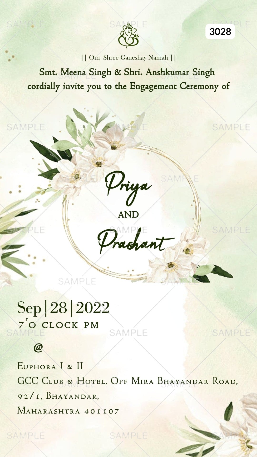 The minimalistic Theme of Engagement ceremony digital invitation Editable Canva Template in green background color. This e-invite editable template is available in English language. It includes elements such as flowers, leaves, round frame, and ganesh icon. This card design can be customized online for free in Canva, and you can edit the couple's name, function name, date, time, venue, and regards. You can also share your card easily via WhatsApp or email.
