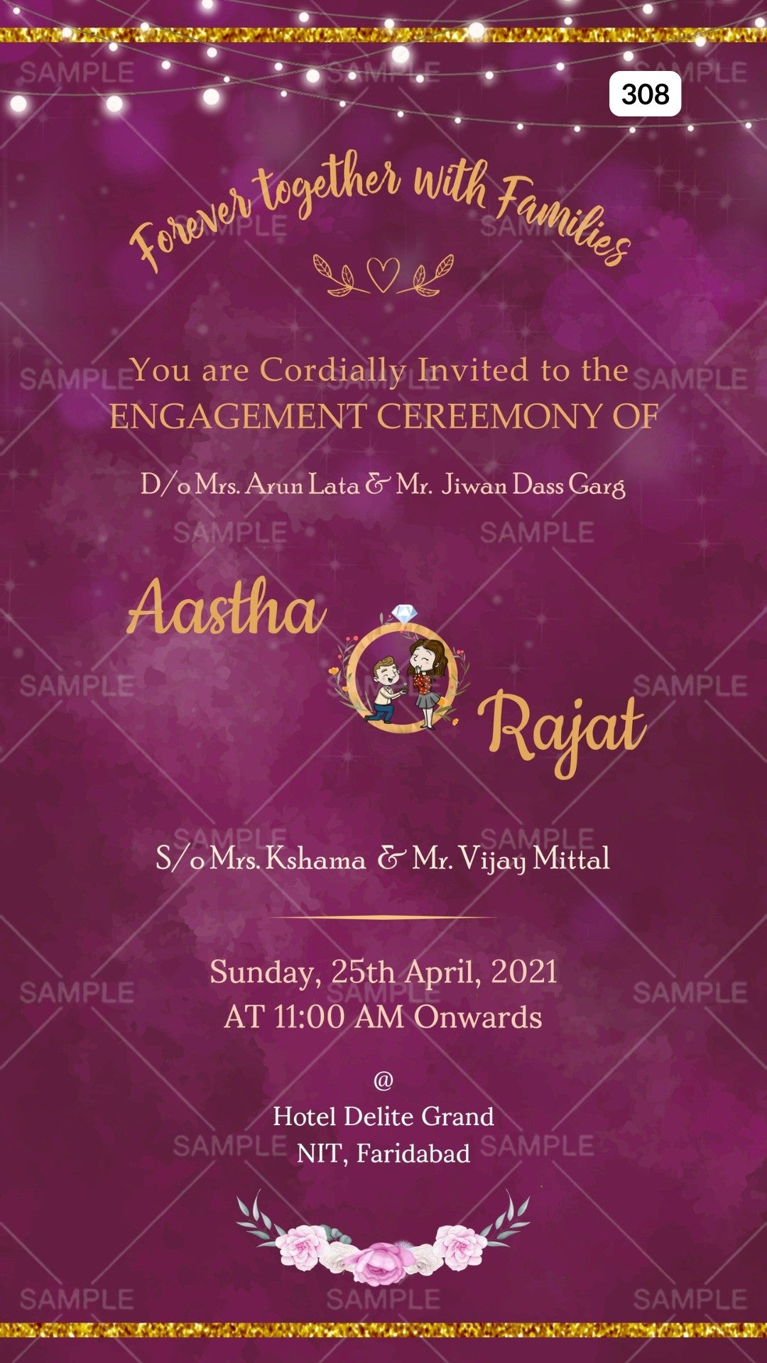 Engagement ceremony invitation card Canva Editable Template in english language with string light as glittery frame theme design 308