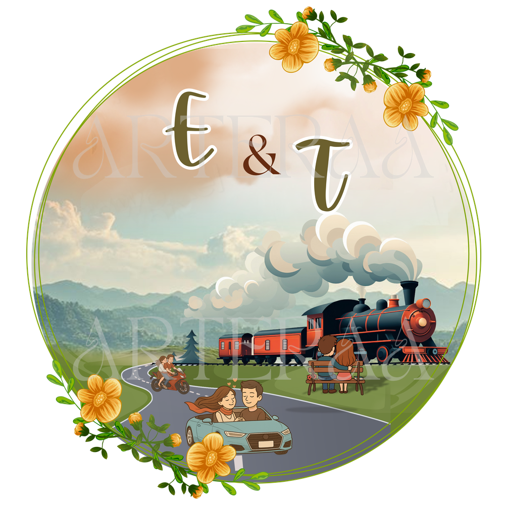 Travel & Train Theme – A whimsical couple’s journey with a scenic train, hills, and floral accents. Great for destination weddings!