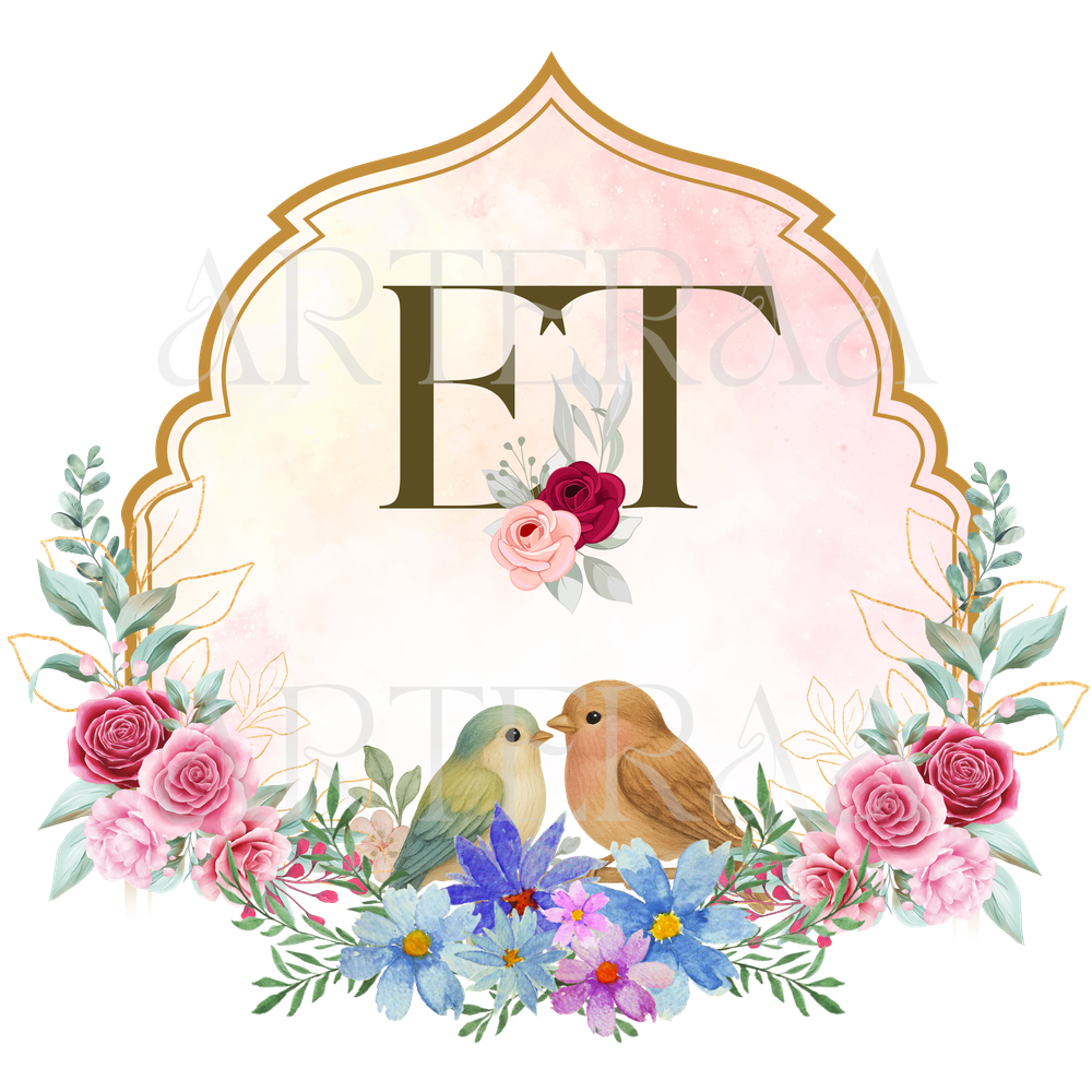 A: You will receive 5 high-resolution PNG files with transparent backgrounds featuring the selected couple initials (e.g., ET). The files are ready to use in digital or printed wedding materials.