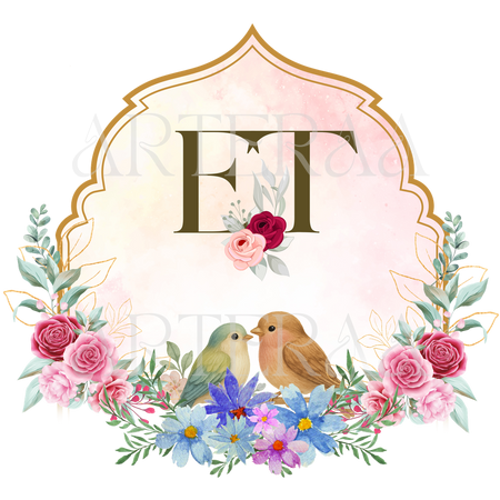 Royal Arch Frame with Love Birds – Luxurious floral arrangement with birds under a Mughal-style arch — perfect for regal invitations.