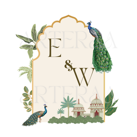 Palatial Peacock Frame – Architectural elegance with domes, leafy greens, and peacocks – a classy pick for classic Indian wedding designs.