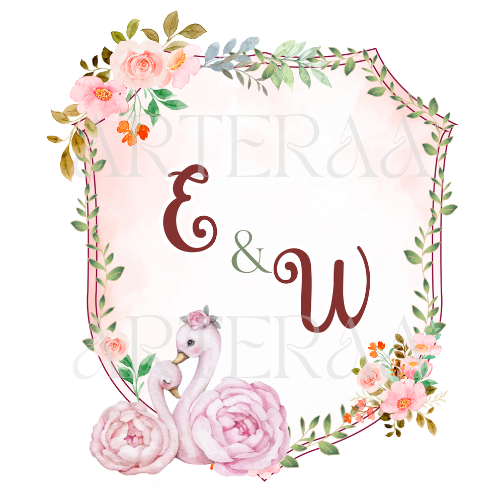 Floral Swan Monogram – Gentle pastel pinks, floral frame, and a pair of swans for an elegant romantic vibe.