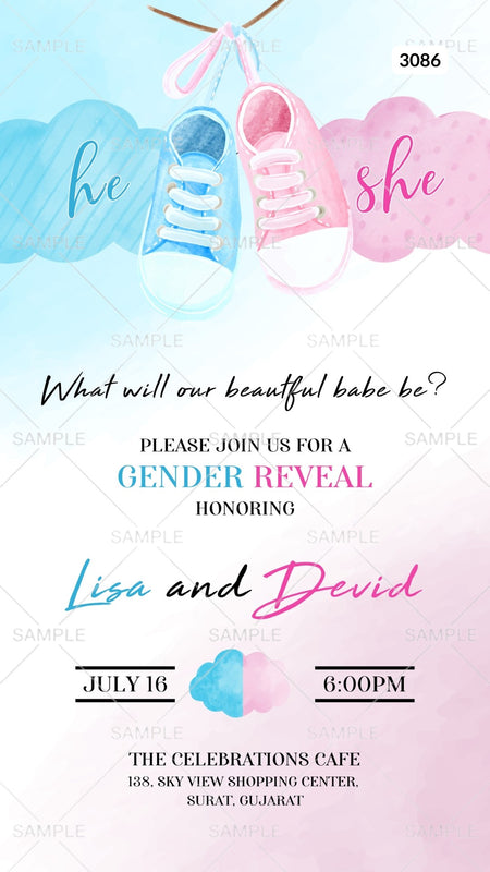 The minimalistic Theme of the Gender Reveal Party digital invitation Editable Canva Template in blue, a pink background color. This Party e-invite editable template is available in the English language. This Baby boy or girl invitation includes elements such as shoes and cloud.This card design can be customized online for free in Canva, and you can edit the function name, date, time, venue, and regards. You can also share your card easily via WhatsApp or email.