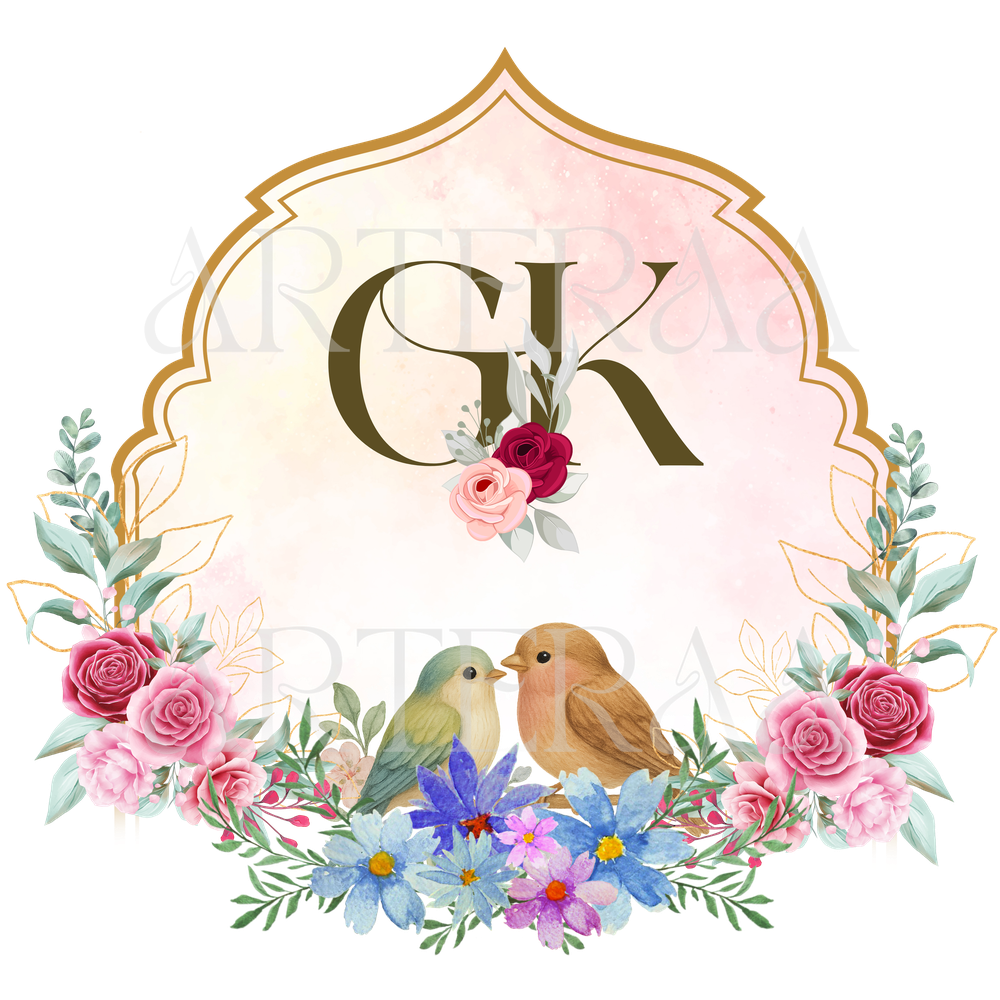 A: You will receive 5 high-resolution PNG files with transparent backgrounds featuring the selected couple initials (e.g., GK). The files are ready to use in digital or printed wedding materials.