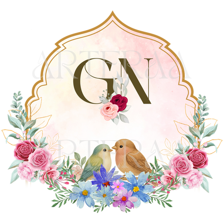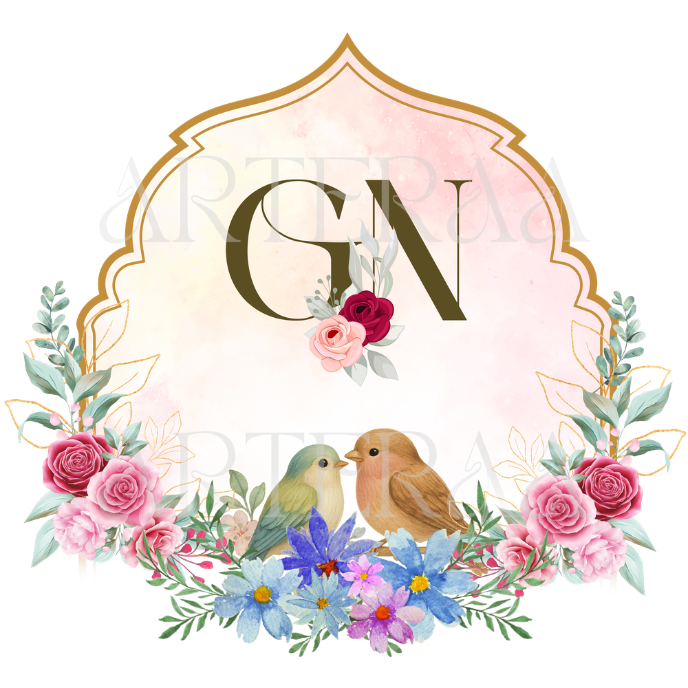 A: You will receive 5 high-resolution PNG files with transparent backgrounds featuring the selected couple initials (e.g., GN). The files are ready to use in digital or printed wedding materials.