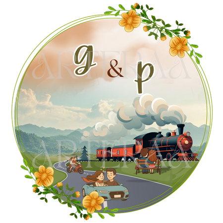 Travel & Train Theme – A whimsical couple’s journey with a scenic train, hills, and floral accents. Great for destination weddings!