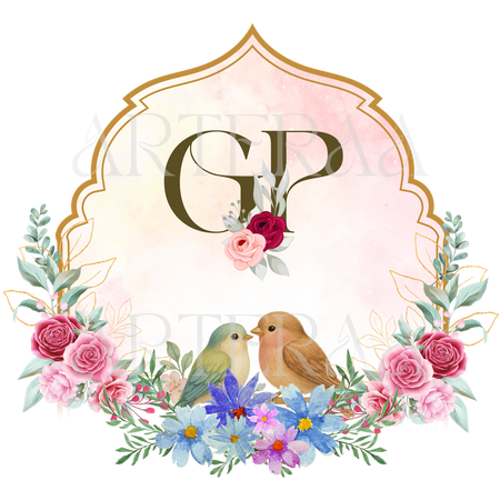 A: You will receive 5 high-resolution PNG files with transparent backgrounds featuring the selected couple initials (e.g., GP). The files are ready to use in digital or printed wedding materials.