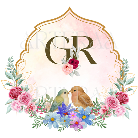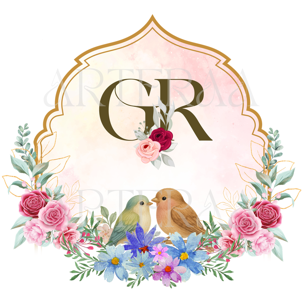 A: You will receive 5 high-resolution PNG files with transparent backgrounds featuring the selected couple initials (e.g., GR). The files are ready to use in digital or printed wedding materials.