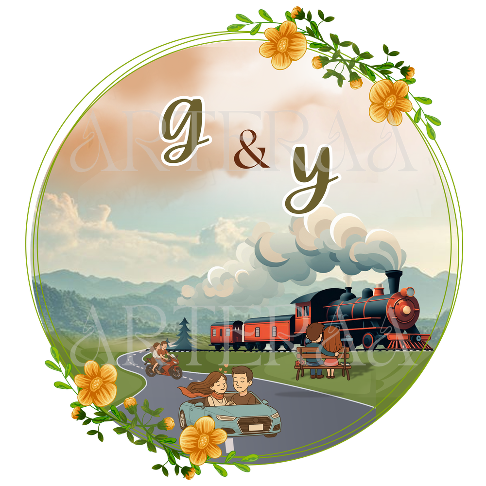 Travel & Train Theme – A whimsical couple’s journey with a scenic train, hills, and floral accents. Great for destination weddings!