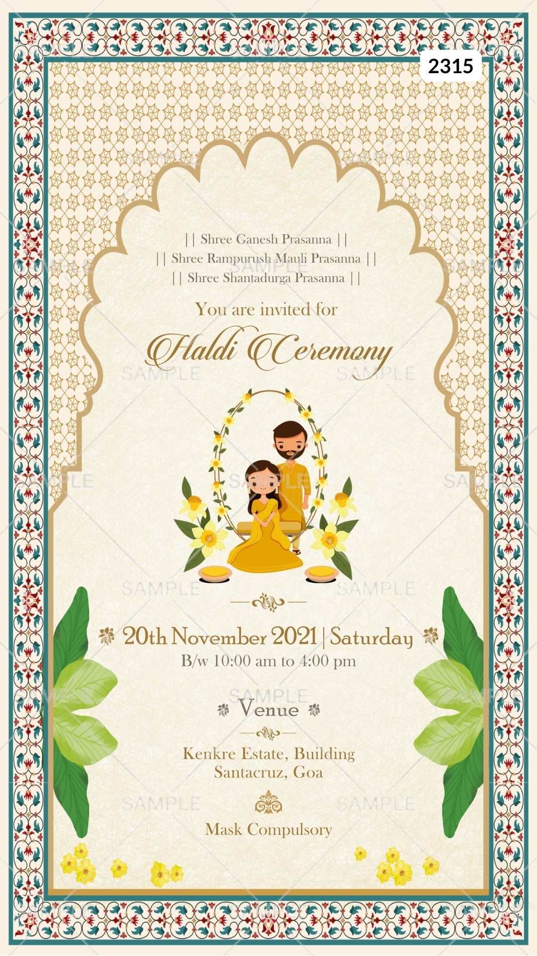Haldi ceremony invitation card Canva Editable Template in english language with couple doodle as vintage theme design 2315