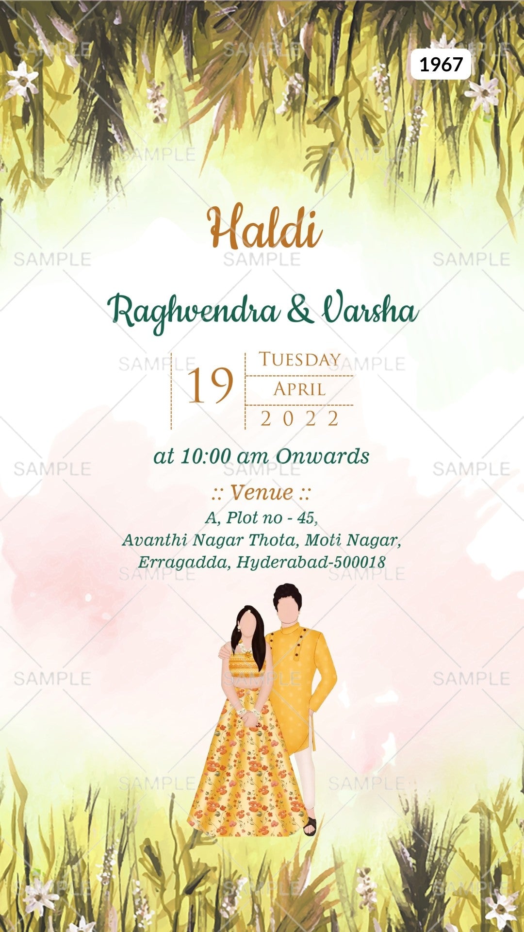 Haldi ceremony invitation card Canva Editable Template in english language with couple doodle, leaves as floral theme design 1967